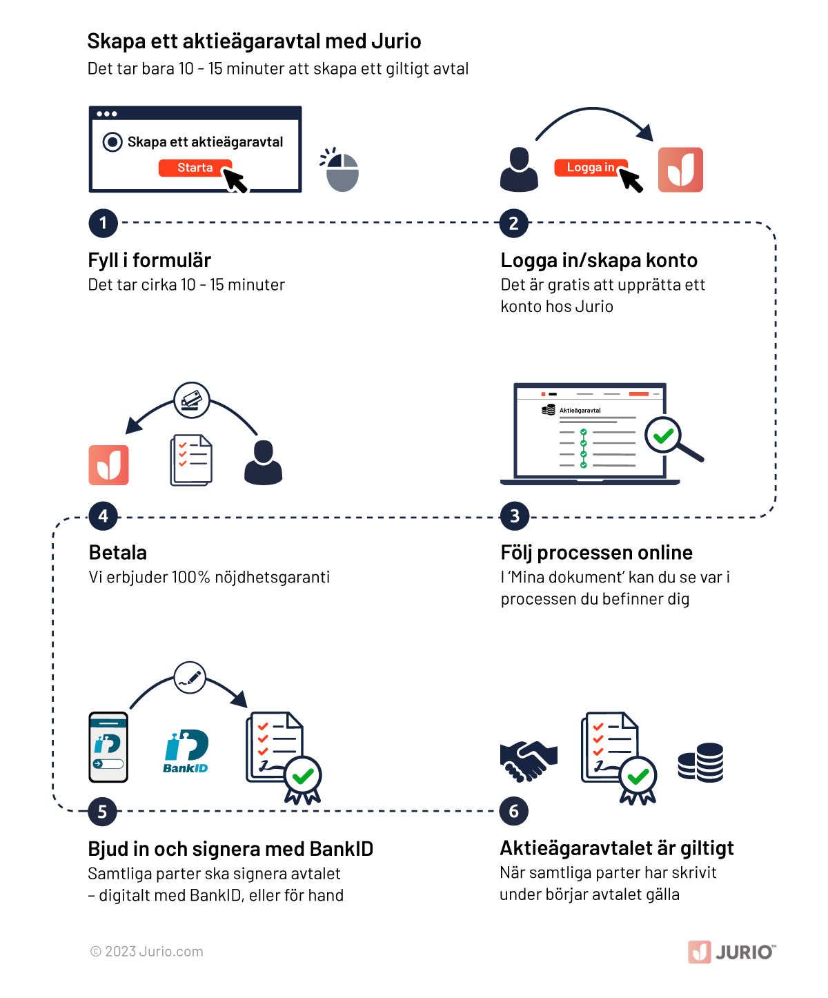 Du kan välja att skriva ett aktieägaravtal på egen hand eller använda en onlinetjänst, såsom vår egen. Med Jurio säkerställer du att allt som bör finnas med i avtalet finns med!