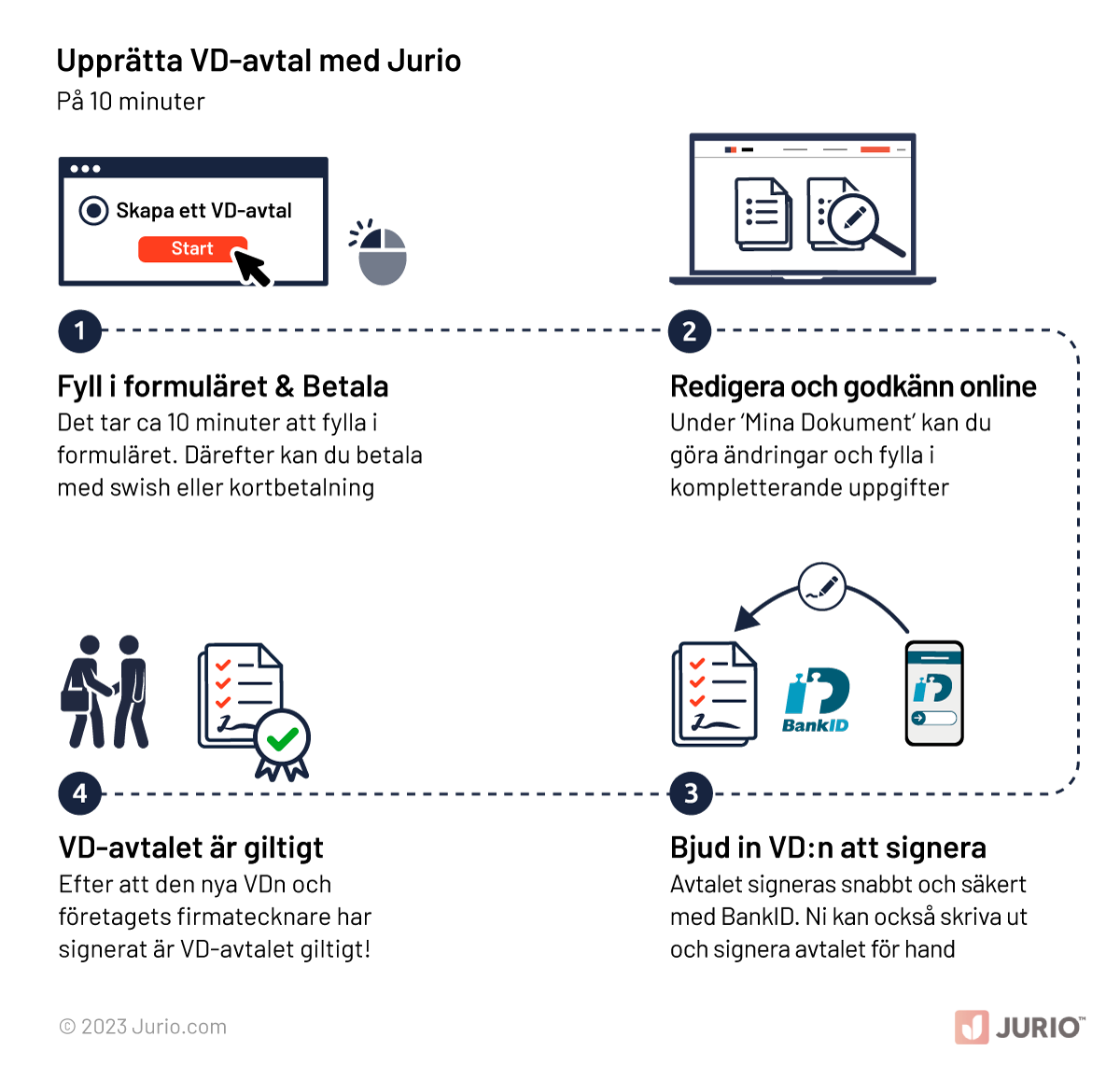 Det är mycket att tänka på när ni ska anställa en VD och det är extra viktigt att anställningsavtalet är anpassat efter era önskemål och behov. Genom att upprätta avtalet hos Jurio skyddar ni verksamheten och vi säkerställer att avtalet innehåller allt nödvändigt. Vi vägleder er genom processen och ni sparar tusenlappar jämfört med att gå till en traditionell jurist.