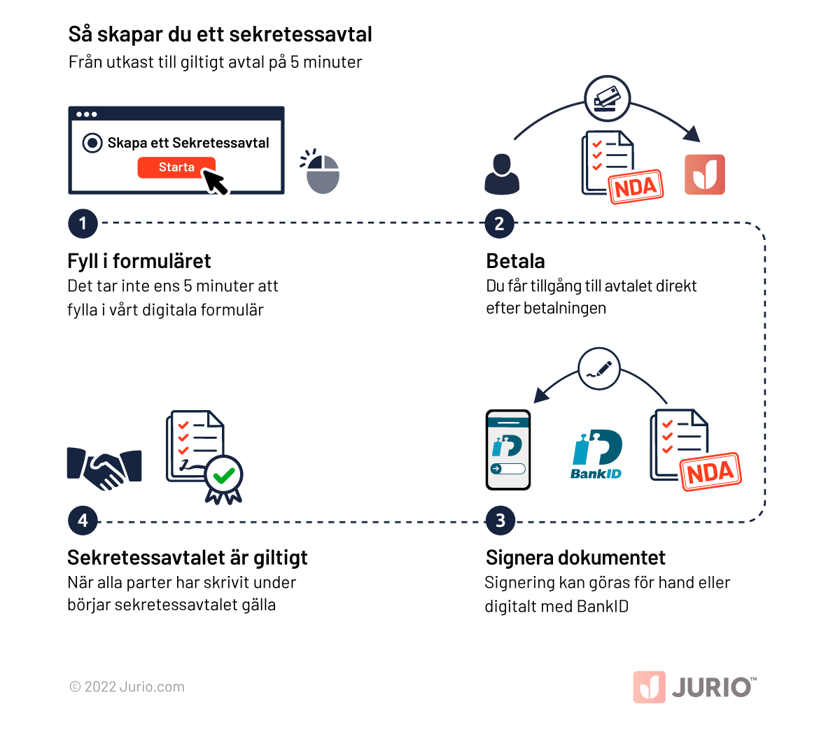 När du skriver ett sekretessavtal med Jurio får du ett heltäckande avtal som kan användas av både företag och privatpersoner. Avtalet är skapat och testat av erfarna jurister, så du kan vara säker på att ditt avtal kommer vara korrekt och juridiskt giltigt. Avtalet innehåller bland annat: