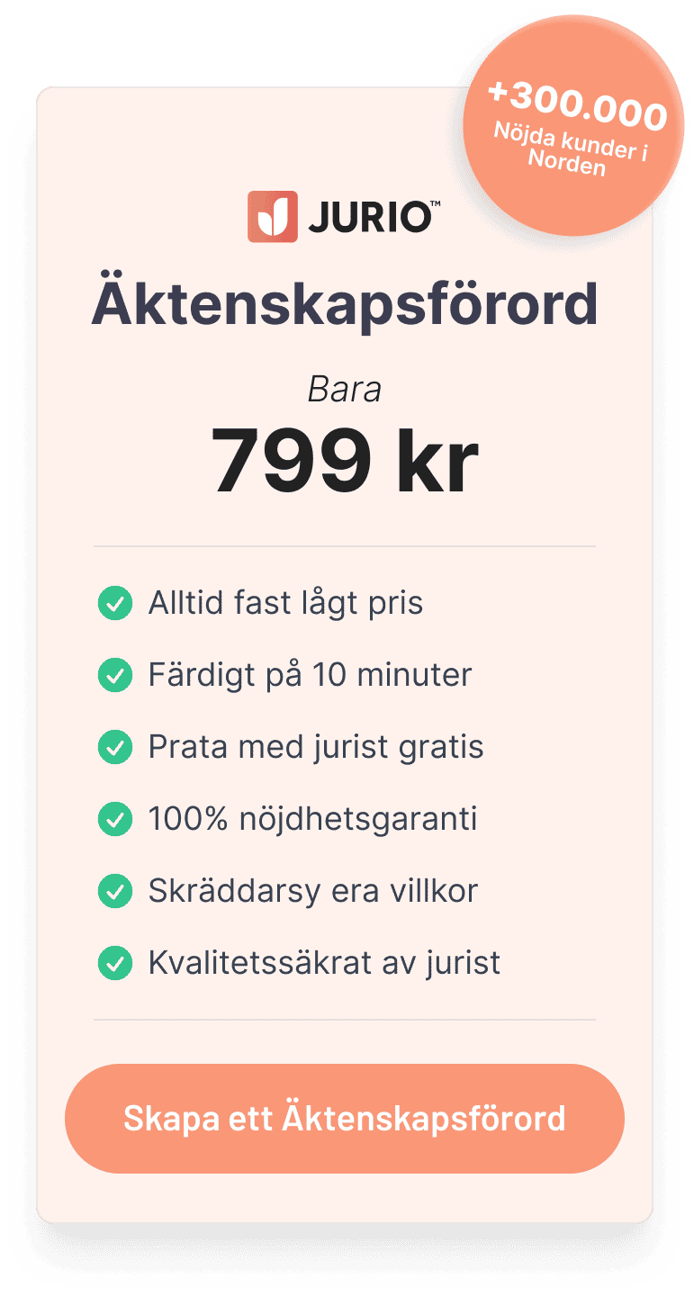 Att skriva ett äktenskapsförord har aldrig varit enklare. Med Jurio kan du komma igång direkt. Vårt formulär leder dig säkert genom processen, så att du får ett personligt anpassat äktenskapsförord som täcker just dina behov och önskemål.