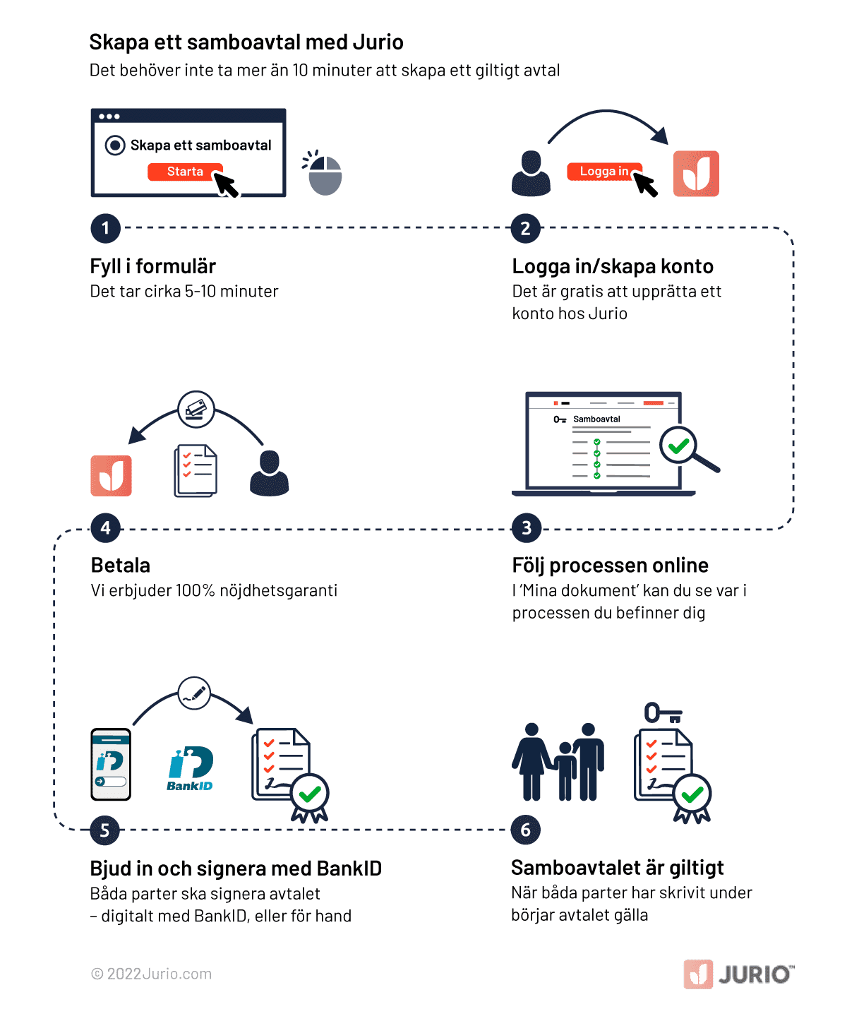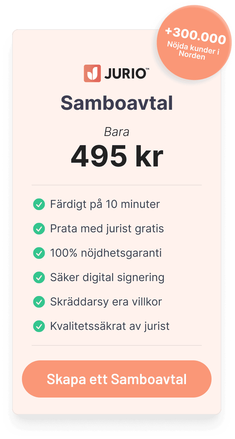 Funderar ni på att flytta ihop, eller är ni redan sambor? Med Jurio kan ni skapa ett skräddarsytt samboavtal som uppfyller just era behov och önskemål – helt online! I vårt smarta formulär får ni svara på ett antal frågor – sedan skapas avtalet automatiskt. När ni har betalat kan ni enkelt signera avtalet digitalt med hjälp av BankID, eller skriva ut det och signera för hand.