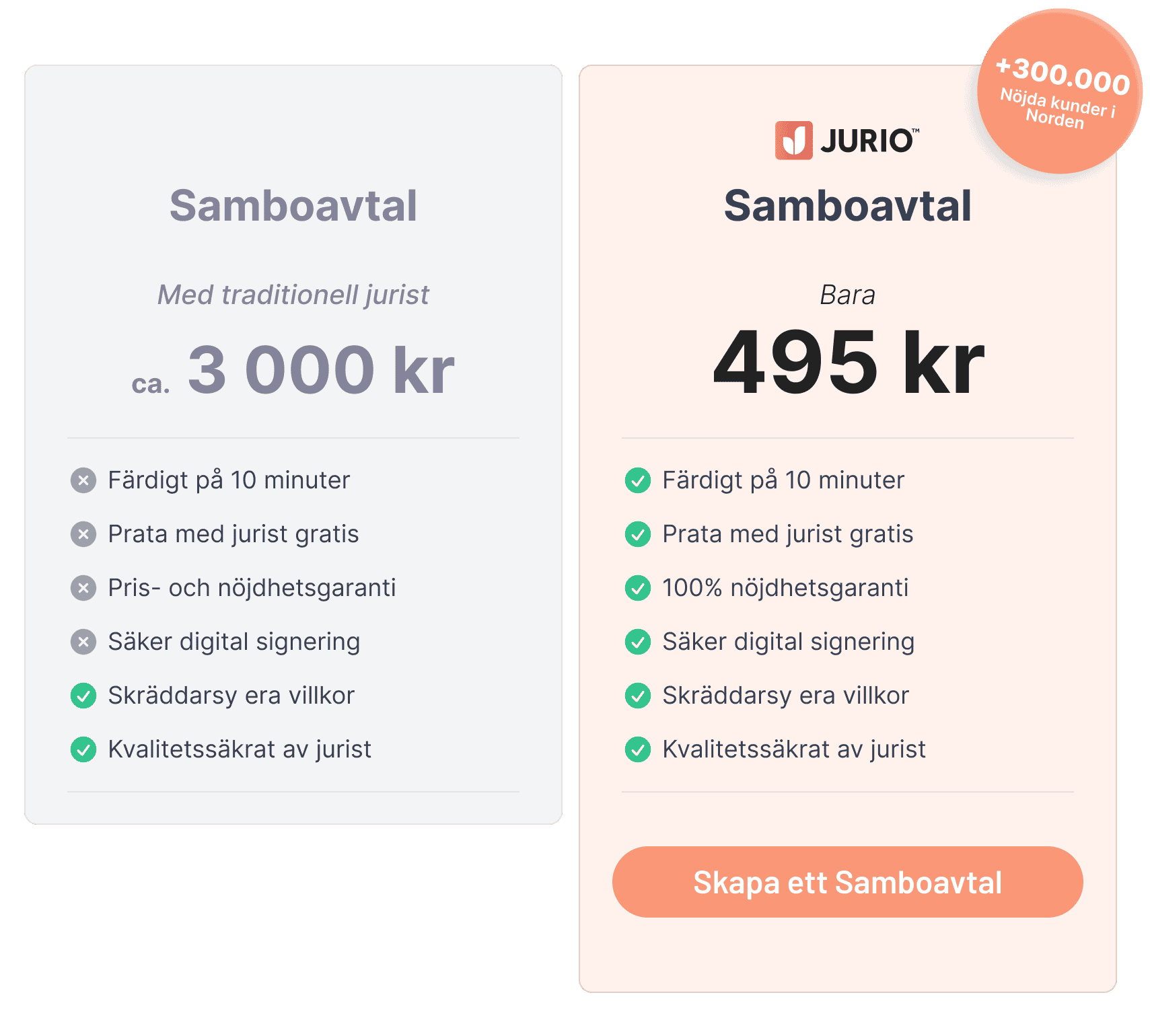 Ett samboavtal kan skiljas drastiskt i priset beroende på vem det är som skriver det. Hos Jurio kan du på 10 minuter få ett skräddarsytt samboavtal för 495 kr.