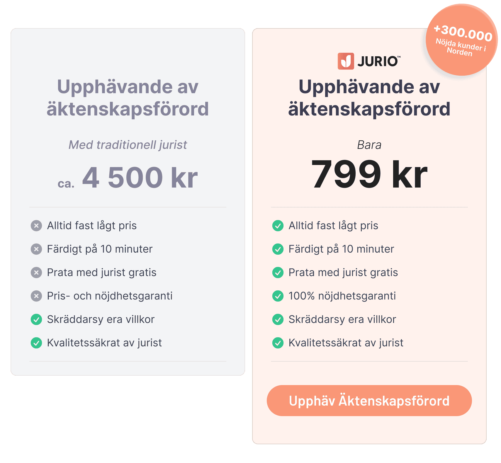 Jurio är en smart digital tjänst som hjälper er att snabbt och smidigt upprätta de juridiska dokument som just ni behöver. Nu har vi tagit fram ett enkelt äktenskapsförord för er som vill upphäva ett tidigare äktenskapsförord. Dokumentet skapas genom att ni svarar på några korta frågor i Jurios smarta formulär. Efter betalning får ni genast tillgång till ert nya äktenskapsförord och instruktioner för hur det ska signeras och skickas till Skatteverket.